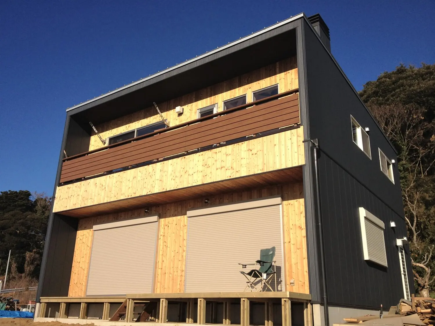 スタイリッシュなガルバリウム鋼板の外壁は濃いネイビーを用い、玄関ドアおよび天井には温かみのある木目を利用しました。