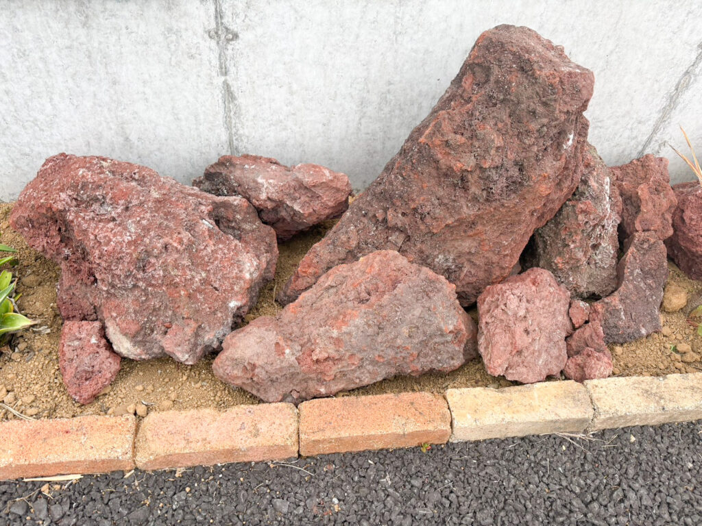 入口にある大きなヤシの木との相性も良く、南国らしい開放感のある景観をより一層引き立てています。ヤシの木の緑とレッドロックの赤みが調和し、訪れる方に印象的で温かみのある雰囲気を感じていただける空間となりました。