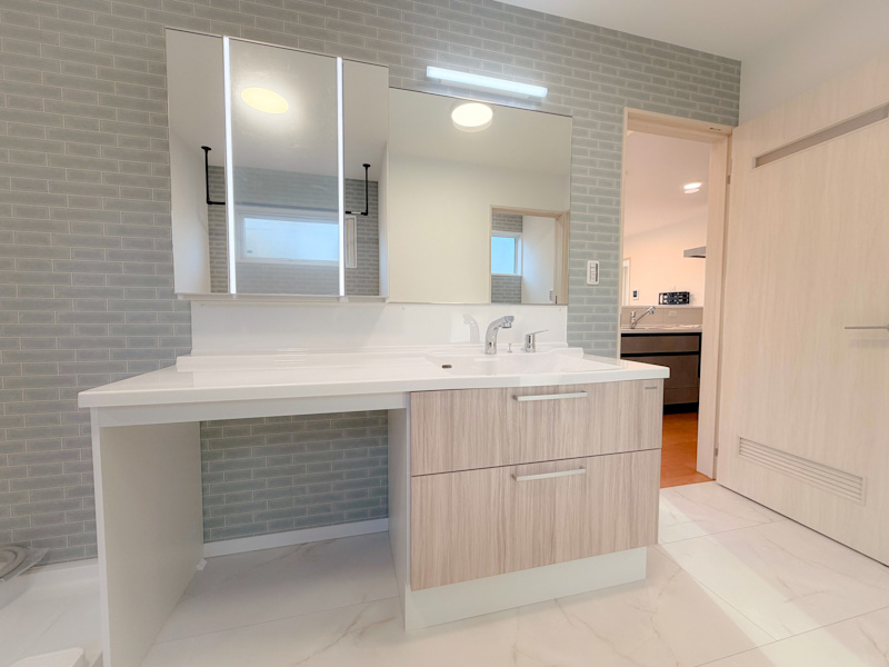 ・ランドリールームはブルー系のタイル調クロスでさわやかな空間に。洗面台は二人並んでも余裕の広さで、朝の混雑を解消
