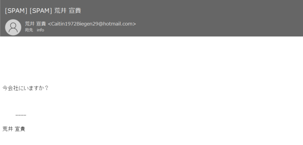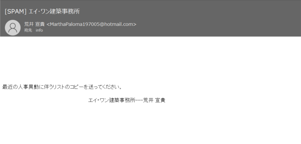メールの送信者名に当社および当社代表者の名前が表示されておりますが、送信元ドメインが当社のもの(@a-1group.net)とは異なります。